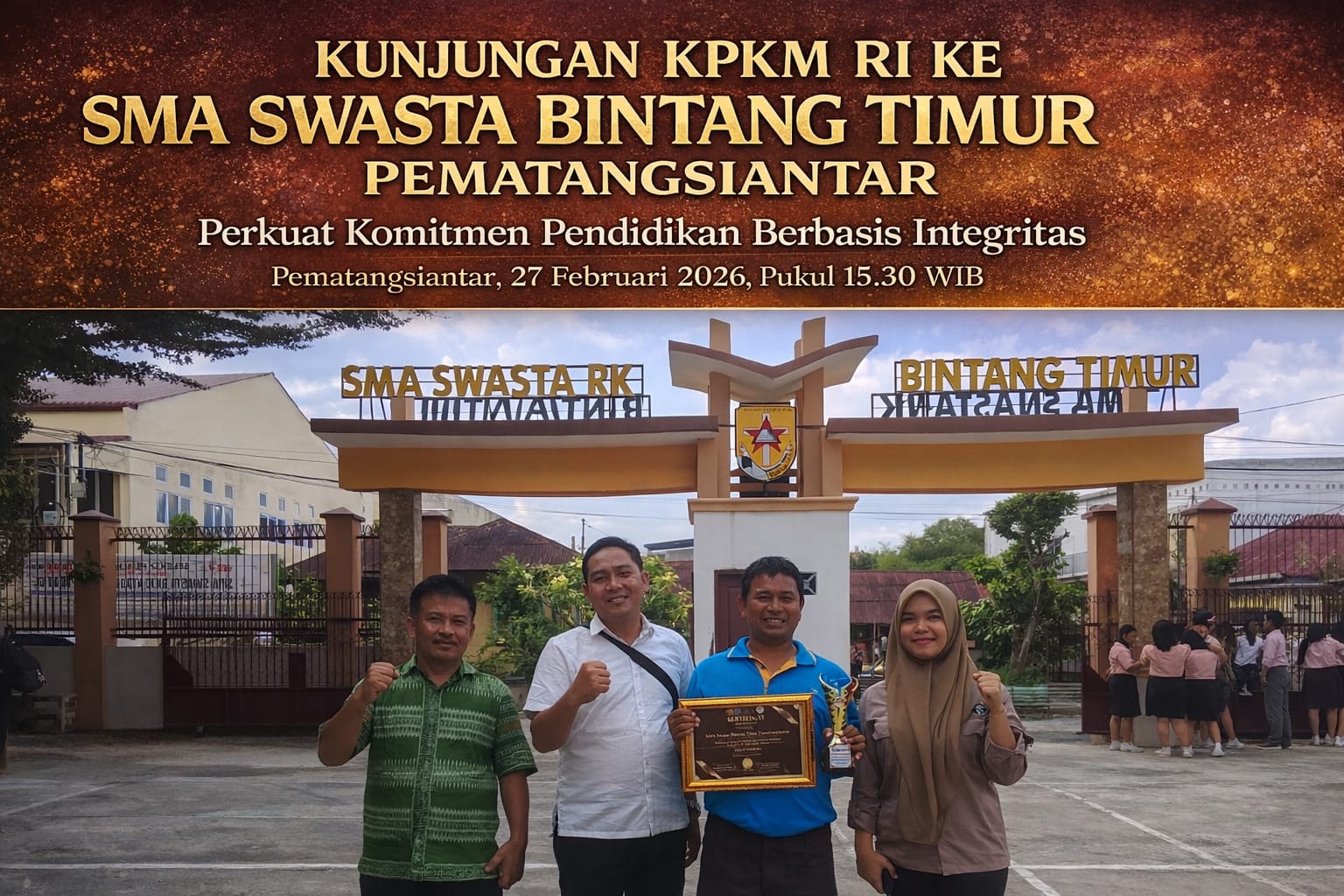 Pematangsiantar, MCB – Jajaran Kongres Pemberantasan Korupsi Manipulatif Rakyat Indonesia (KPKM RI) melakukan kunjungan resmi ke SMA Swasta Bintang Timur Pematangsiantar pada pukul 15.30 WIB sebagai tindak lanjut atas penghargaan Satuan Pendidikan Berbasis Integritas & Tata Kelola Bersih yang diraih sekolah tersebut pada ajang KPKM RI Award 2026 tingkat Cabdisdik Wilayah VI.