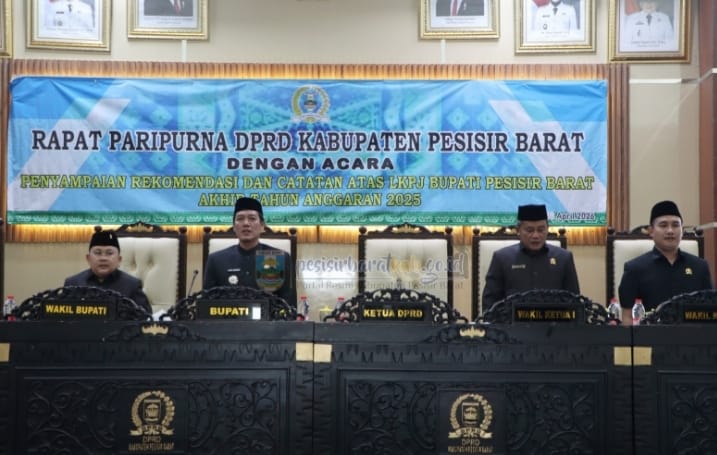 KRUI, MCB – Bupati Pesisir Barat, Dedi Irawan, menyampaikan rekomendasi dan catatan atas Laporan Keterangan Pertanggungjawaban (LKPJ) Bupati Pesisir Barat tahun anggaran 2025 dalam Rapat Paripurna DPRD Pesisir Barat yang digelar di ruang rapat paripurna DPRD, Kamis (9/04/2026).