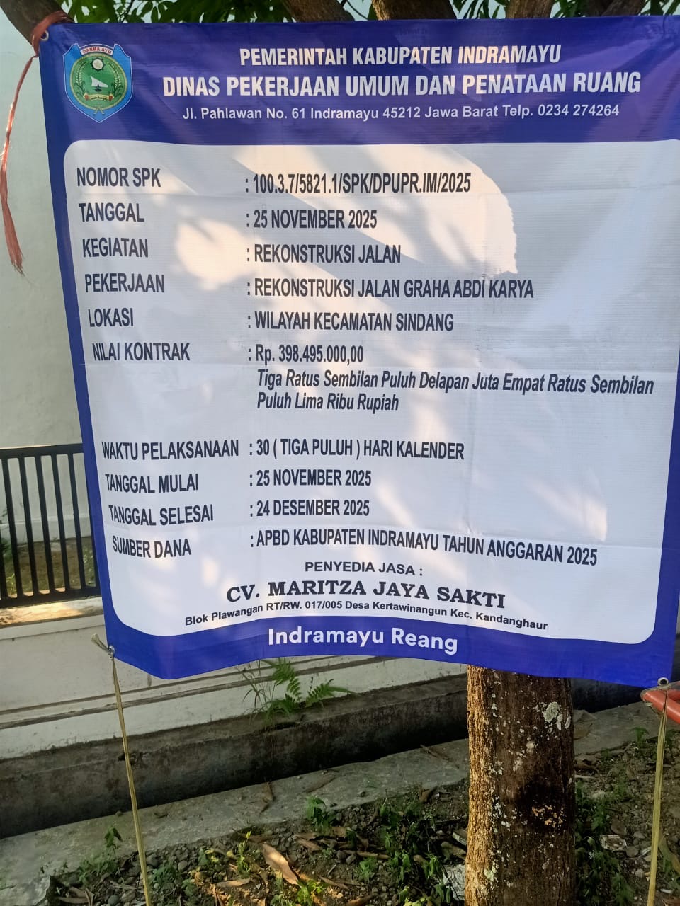 Berdasarkan papan proyek, pekerjaan tersebut dilaksanakan oleh CV Maritza Jaya Sakti yang beralamat di Blok Lawangan, Desa Kertawinangun, Kecamatan Kandanghaur.